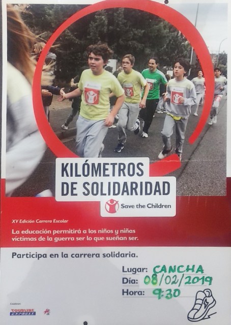 El colegio Juan del Rio Ayala organizará una carrera solidaria para recaudar fondos para la organización «Save the Children» el viernes 8 de febrero a las 9:30. La carrera tendrá lugar en la Cancha del Colegio donde profesores, padres y alumnos desde infantil hasta primaria correrán kilómetros de solidaridad para ayudar a niños y niñas víctimas de la guerra.