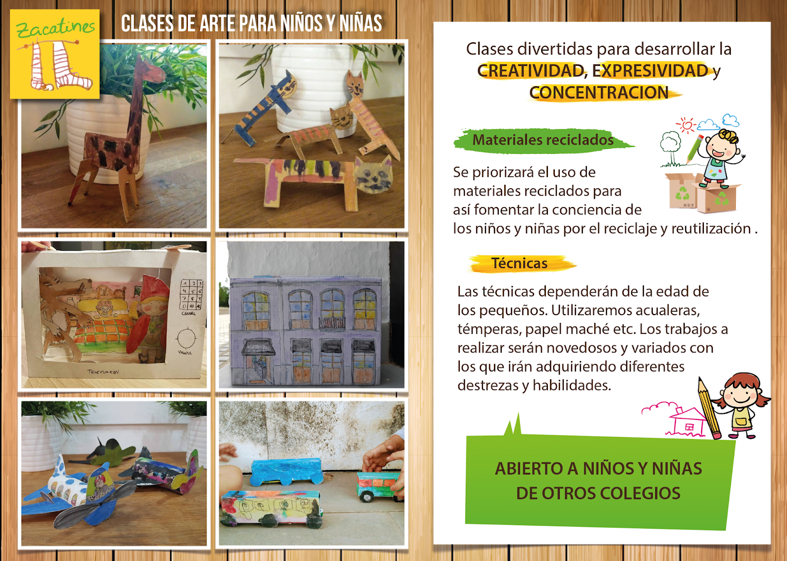 Les informamos que en Marzo va a comenzar una nueva actividad extraescolar de Arte para niños y niñas en nuestro colegio, dónde podrán desarrollar la creatividad, expresividad y concentración a la vez que se divierten usando diferentes técnica y materiales reciclados.