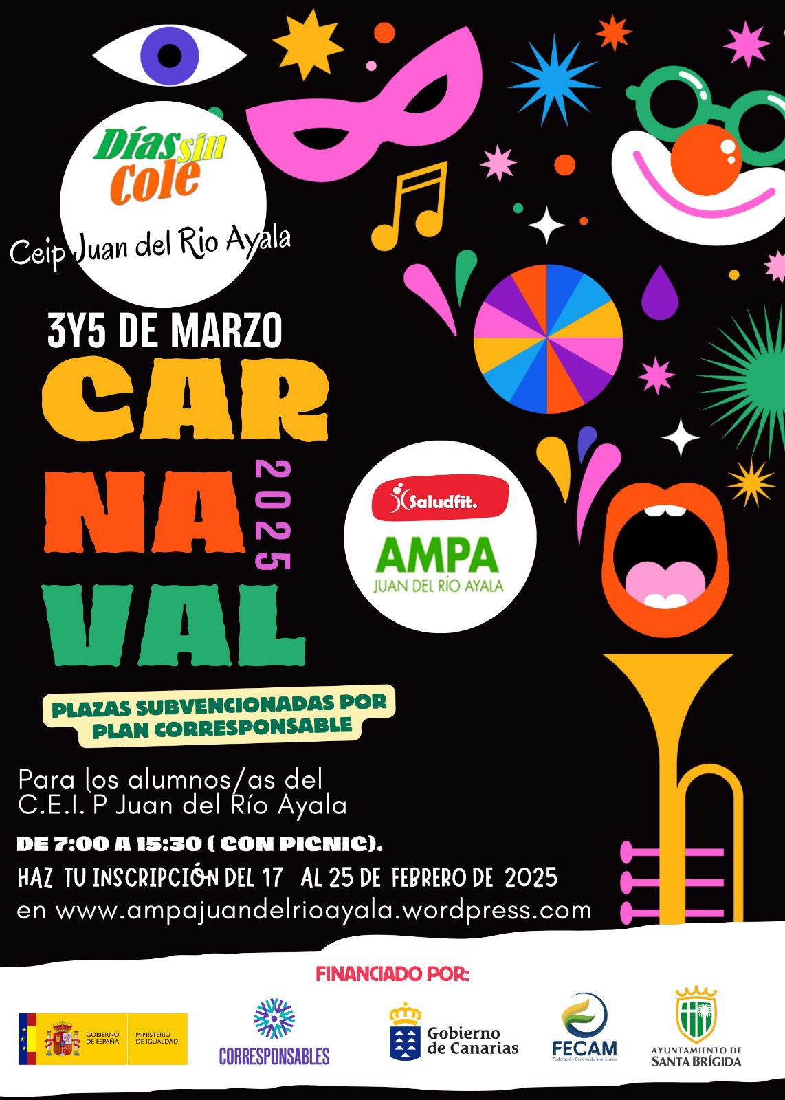 La AMPA Juan del Río Ayala para facilitar la conciliación familiar invertirá esta subvención en varios proyectos. El primero fue el Campus de Navidad, y el segundo son los días sin cole de carnaval, imprescindible para que muchas familias puedan conciliar, de la mano de Saludfit, les ofrecemos 45 plazas subvencionadas, es decir, totalmente gratuitas. Si no hay más de 45 inscripciones, todas serán gratuitas. Si hay más de 45, se tendría que baremar, y esta labor la va a realizar la Concejalía de asuntos sociales del Ayuntamiento de Santa Brígida, para saber quiénes acceden a esas plazas gratuitas.