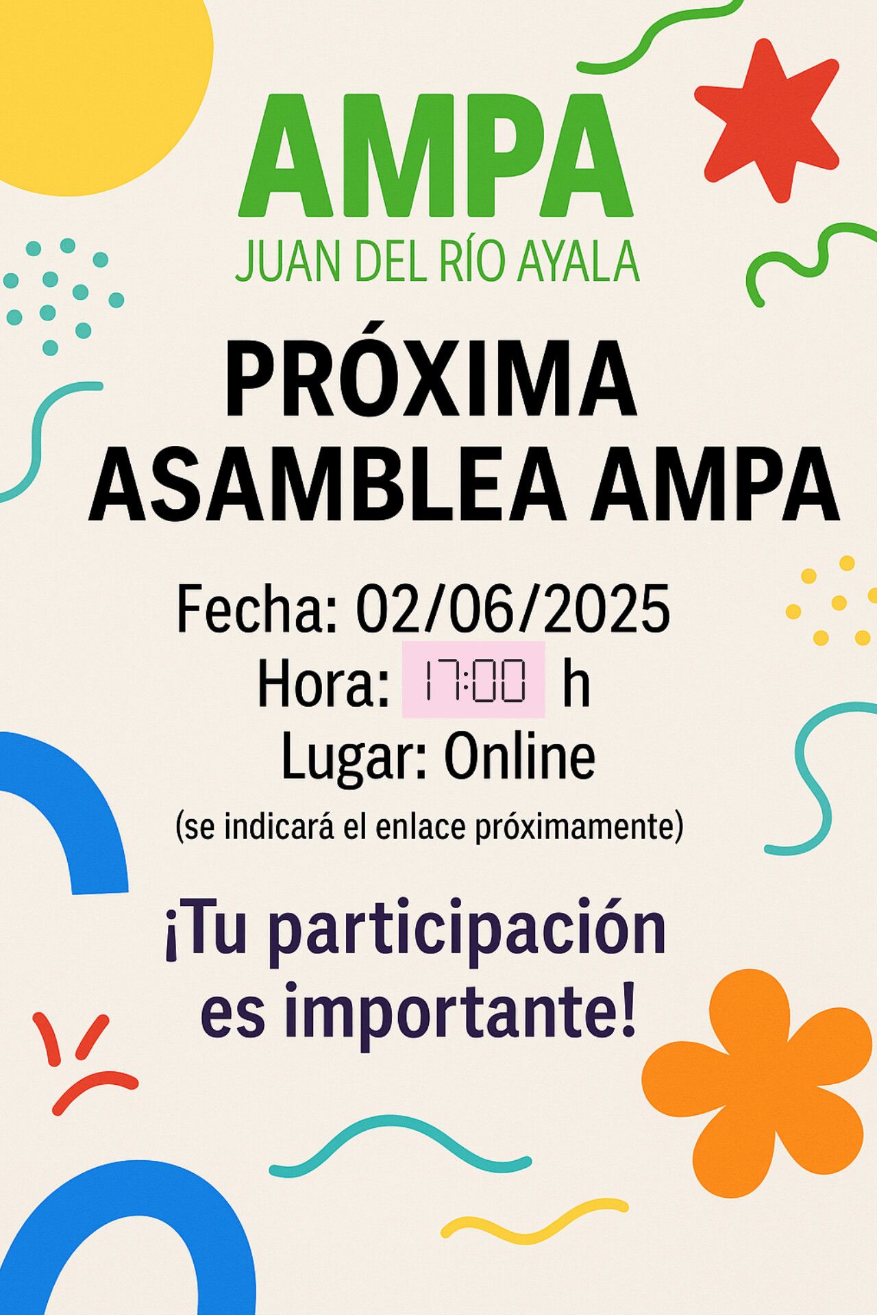 La próxima asamblea de socios y socias de la AMPA y última de este curso será: