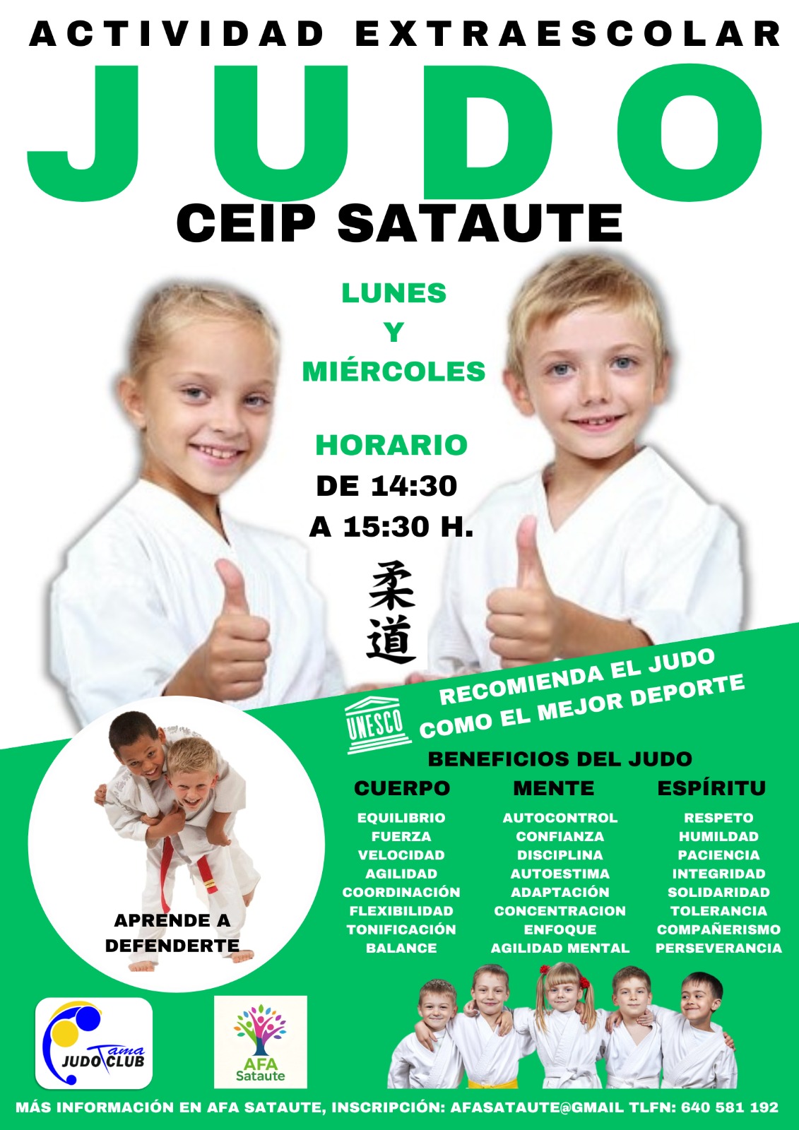 El Judo es divertido. Su práctica, desde las más tempranas edades, supone un excelente método de educación física que subraya los valores del respeto por el/la compañero/a, el autocontrol, el juego, la disciplina, el esfuerzo y la superación constante basada en el progreso de uno/a mismo/a. La práctica del Judo, en un ambiente de armonía y convivencia, permite al alumno/a aprender a desarrollar progresivamente sus capacidades físicas y mentales