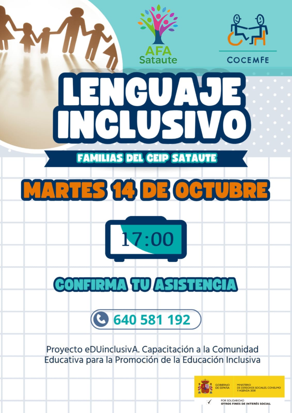 Les recordamos que el próximo martes 14 de octubre a las 17:00 h tendrá lugar en el colegio una charla para familias sobre “Lenguaje inclusivo”, organizada por COCEMFE dentro del proyecto eDUinclusiva: Capacitación a la Comunidad Educativa para la Promoción de la Educación Inclusiva, con el apoyo del Gobierno de España. Ministerio de Derechos Sociales, Consumo y Agenda 2030.