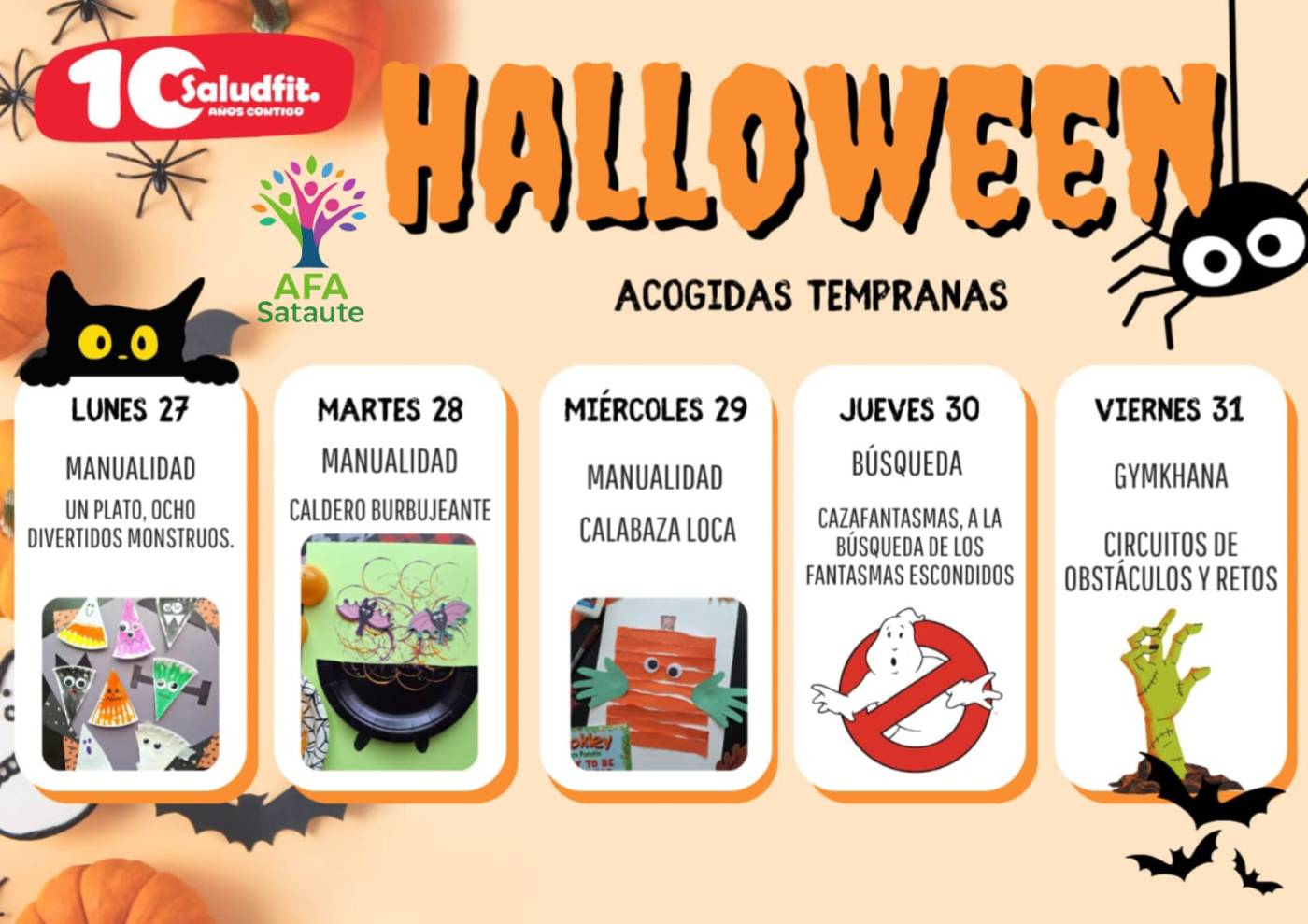Durante esta semana, nuestros y nuestras madrugadores/as ,es decir, todos los niños y niñas que hacen uso del servicio de acogida temprana podrán disfrutar de una experiencia terroríficamente divertida. Saludfit ha preparado diversas actividades temáticas, como manualidades especiales, búsquedas de fantasmas escondidos y una emocionante gymkana, pensadas para fomentar la creatividad, el trabajo en equipo y, por supuesto, la diversión.
