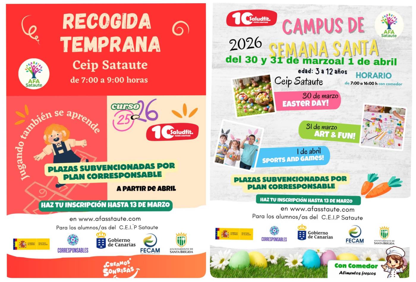 Les recordamos que estamos con las inscricpiones abiertas para solicitar plaza subvencionada por el Plan corresponsables para la acogida temprana, y la recogida tardía a partir de abril (tendremos plazas subvencionadas lo que queda de curso, abril, mayo y junio) y también para el campus de semana santa.