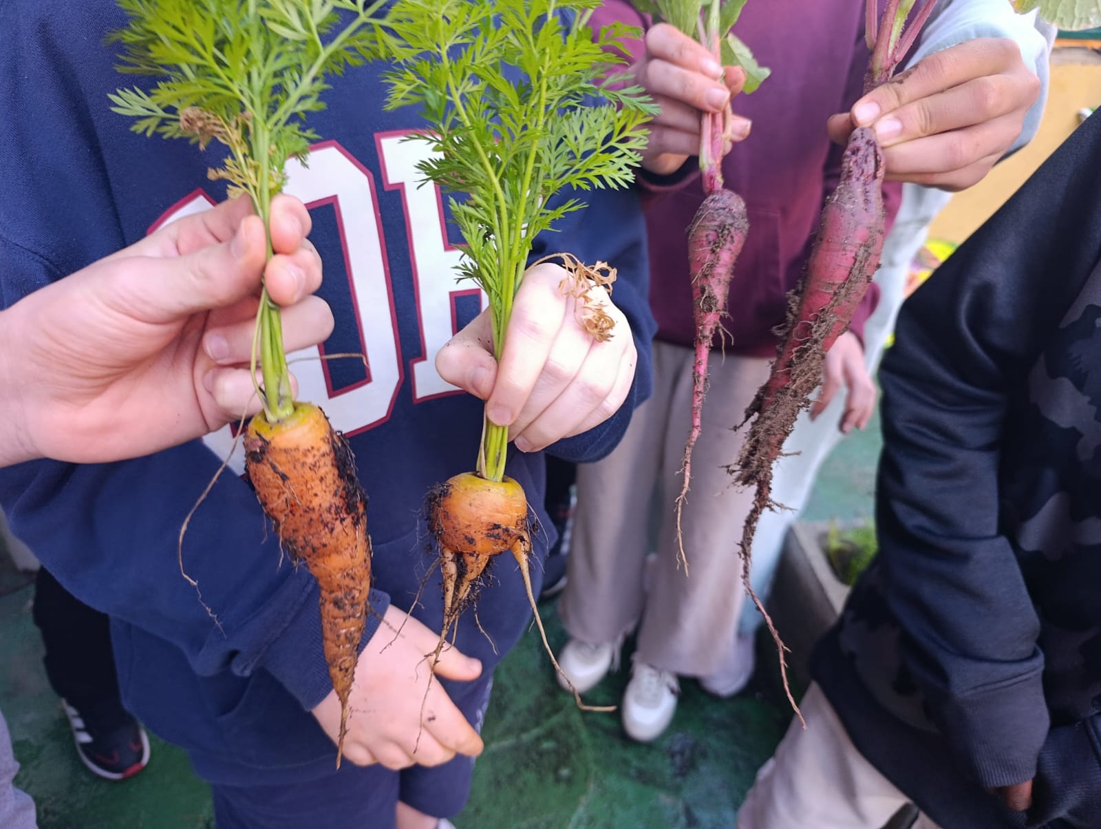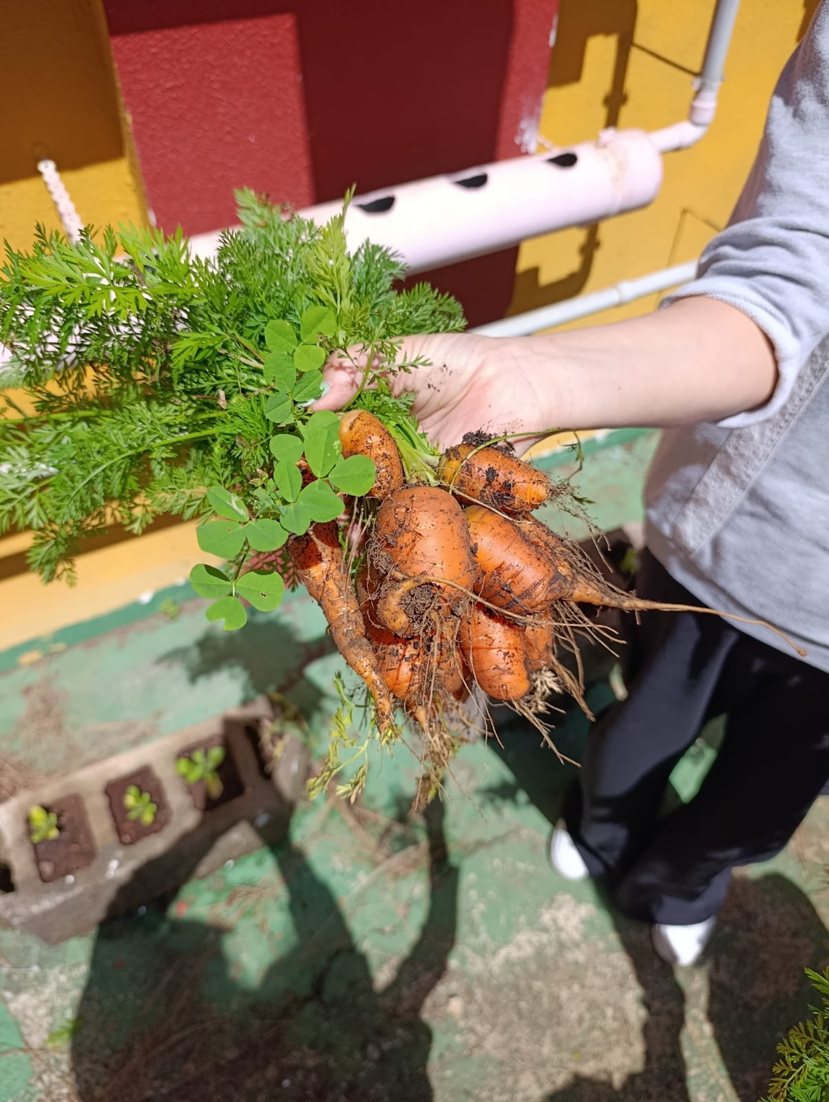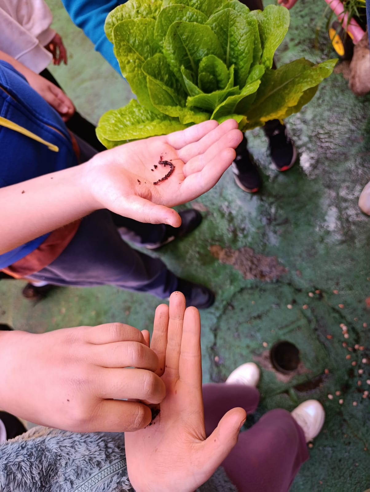 Con el grupo de 5 años A: - Se alimentan las lombrices, introducimos las aromáticas (romero y lavanda), realizamos diversos trasplantes preparando previamente la tierra y se realiza tremenda cosecha de zanahorias que quedan en compartir con el otro grupo de 5 años.