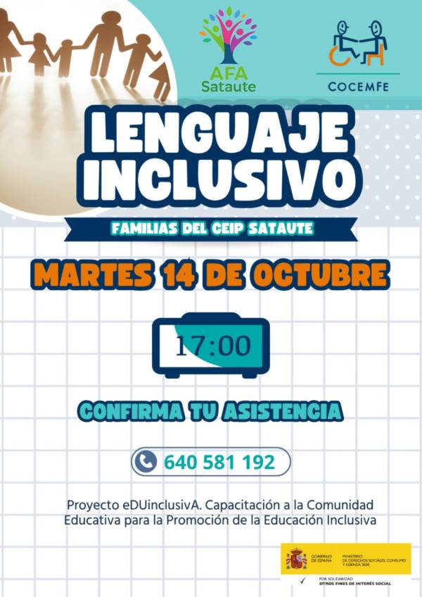 Estimadas familias: El próximo martes 14 de octubre a las 17:00 h tendrá lugar en el colegio una charla para familias sobre “Lenguaje inclusivo”, organizada por COCEMFE dentro del proyecto eDUinclusiva: Capacitación a la Comunidad Educativa para la Promoción de la Educación Inclusiva, con el apoyo del Gobierno de España. Ministerio de Derechos Sociales, Consumo... Leer más →